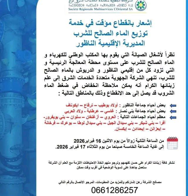 تُعلم الشركة الجهوية متعددة الخدمات الشرق زبنائها الكرام بأن هناك انخفاضا مؤقتا في ضغط الماء الصالح للشرب قد يصل إلى حد الانقطاع، وذلك نتيجة أشغال الصيانة التي ينفذها المكتب الوطني للكهرباء والماء الصالح للشرب على مستوى محطة المعالجة الرئيسية، التي تزود إقليمي الناظور والدريوش بالمياه.