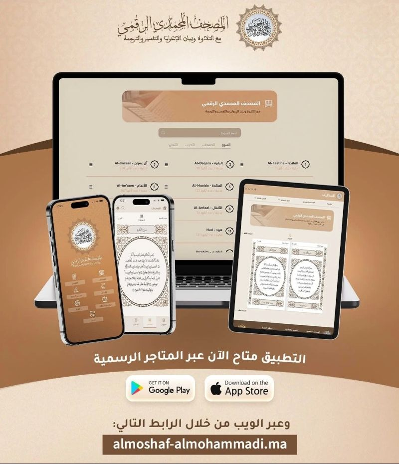في إطار العناية السامية التي يوليها أمير المؤمنين صاحب الجلالة الملك محمد السادس نصره الله لكتاب الله العزيز، أطلقت وزارة الأوقاف والشؤون الإسلامية تطبيق المصحف المحمدي الرقمي، و هو منصة رقمية شاملة تهدف إلى تعزيز نشر القرآن الكريم و تيسير الولوج إليه في عصر التحول الرقمي.