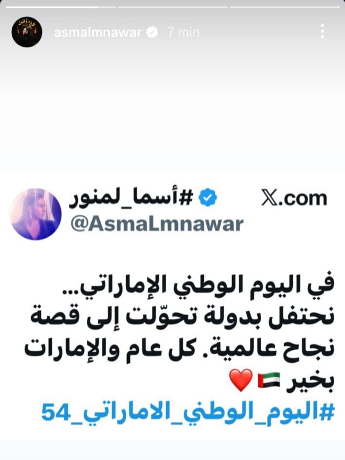 أما أسماء لمنور، فعبّرت عبر تغريدة على منصة “إكس” عن اعتزازها بالإمارات، قائلة: “نحتفل بدولة تحولت إلى قصة نجاح عالمية.. كل عام والإمارات بخير”.