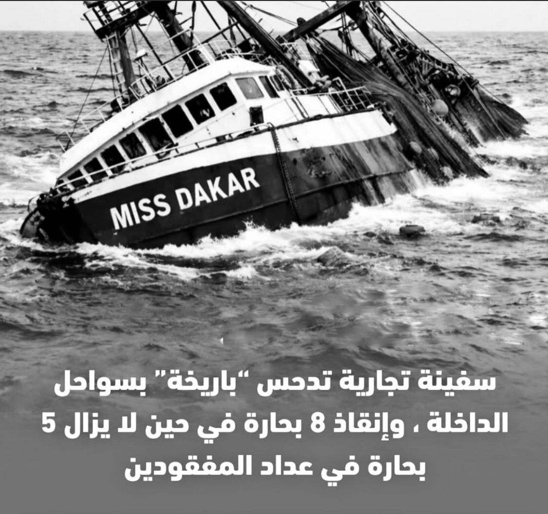 شهدت سواحل مدينة الداخلة، صباح الأربعاء، حادثاً بحرياً مأساوياً بعد اصطدام سفينة تجارية بمركب الصيد الساحلي «ميس دكار 2» (صنف الجر) على بعد حوالي 80 ميلاً بحرياً من ميناء الداخلة. وأسفر الحادث عن إنقاذ ثمانية بحارة، فيما لا يزال خمسة آخرون في عداد المفقودين رغم الجهود المكثفة التي تبذلها فرق الإنقاذ.