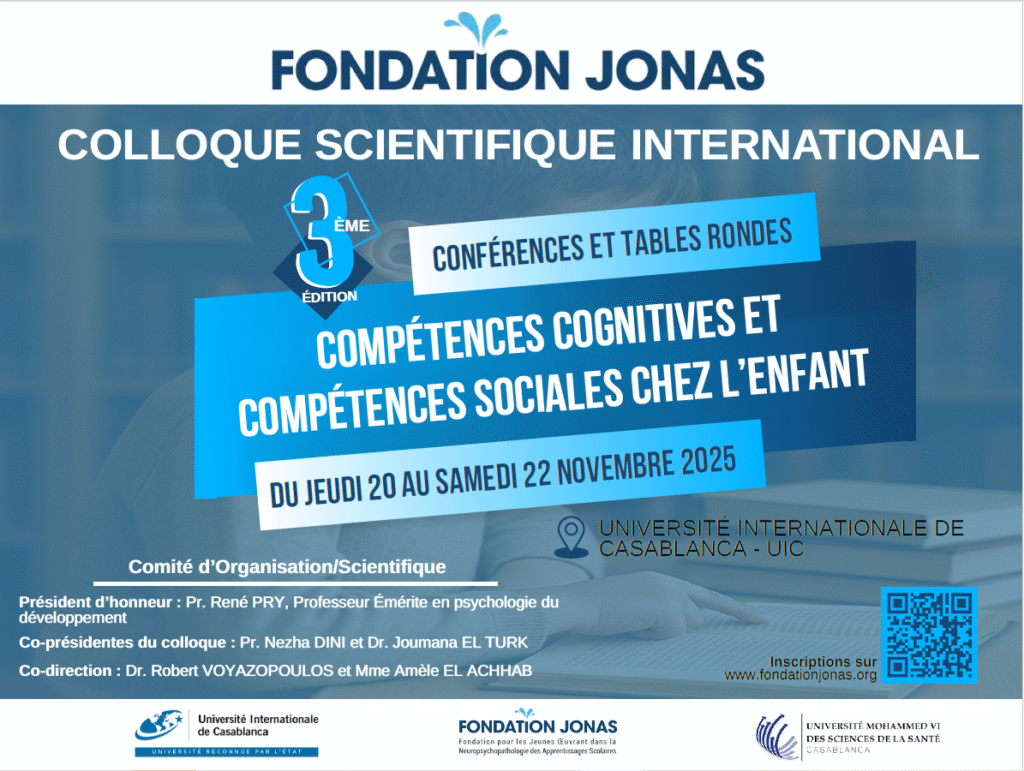 تُطلق مؤسسة جوناس بالتعاون مع الجامعة الدولية بكازابلانكا الدورة الثالثة للملتقى العلمي الدولي «الكفاءات المعرفية والكفاءات الاجتماعية عند الطفل» من 20 إلى 22 نونبر 2025، في تجمع علمي رفيع المستوى يحشد ألمع الباحثين والأطباء النفسانيين والتربويين العالميين لكشف كيف تتشابك الذاكرة والانتباه واللغة والتفكير مع التعاطف والتعاون والتحكم العاطفي في مسار نمو الطفل، سواء كان نمواً عادياً أو استثنائياً.
