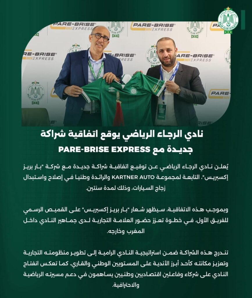 يواصل نادي الرجاء الرياضي مساره نحو تعزيز حضوره التجاري والرياضي، بإعلانه عن توقيع اتفاقية شراكة جديدة مع شركة “بار بريز إكسبريس”، التابعة لمجموعة KARTNER AUTO والرائدة في إصلاح واستبدال زجاج السيارات بالمغرب.