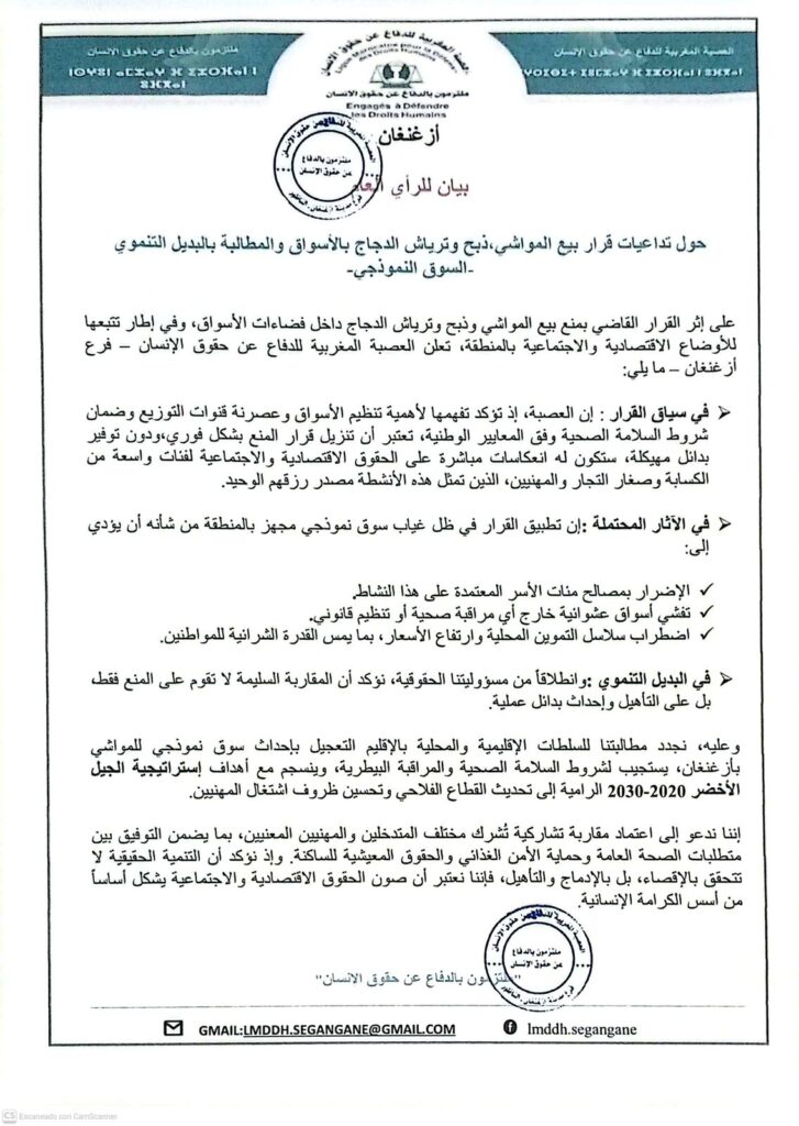على إثر القرار القاضي بمنع بيع المواشي وذبح وترياش الدجاج داخل فضاءات الأسواق، عبرت العصبة المغربية للدفاع عن حقوق الإنسان – فرع أزغنغان – عن قلقها البالغ من انعكاسات هذا القرار على الأسر المعتمدة على هذه الأنشطة كمصدر رزق أساسي.