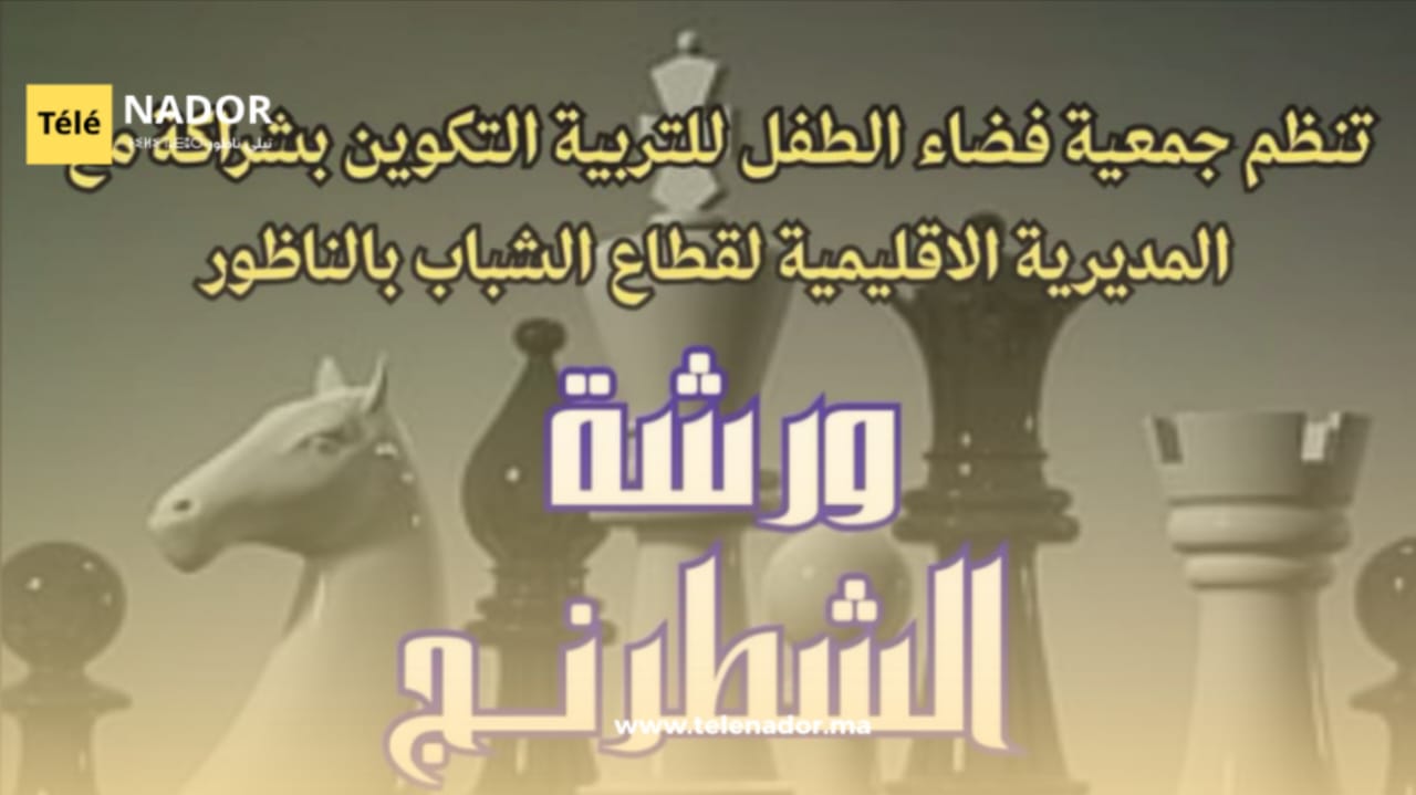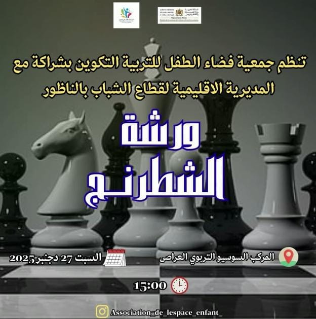 تنظم جمعية فضاء الطفل للتربية والتكوين، بشراكة مع المديرية الإقليمية لقطاع الشباب بالناظور، ورشة الشطرنج يوم السبت 27 دجنبر 2025، بالمركب السوسيو تربوي العراصي على الساعة 15:00، وذلك ضمن أنشطتها الرامية إلى تنمية مهارات الشباب وتعزيز التفكير الاستراتيجي لديهم.