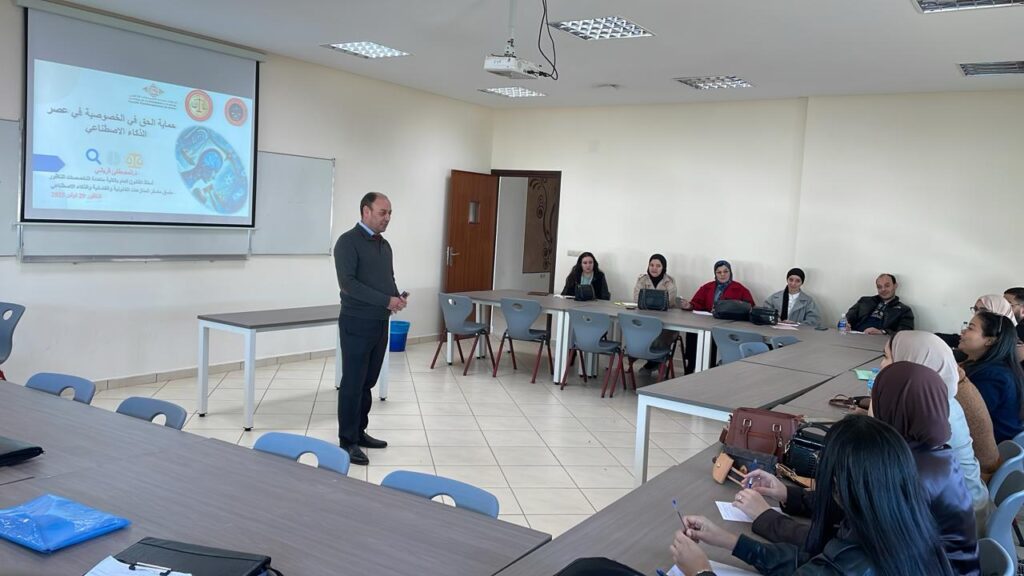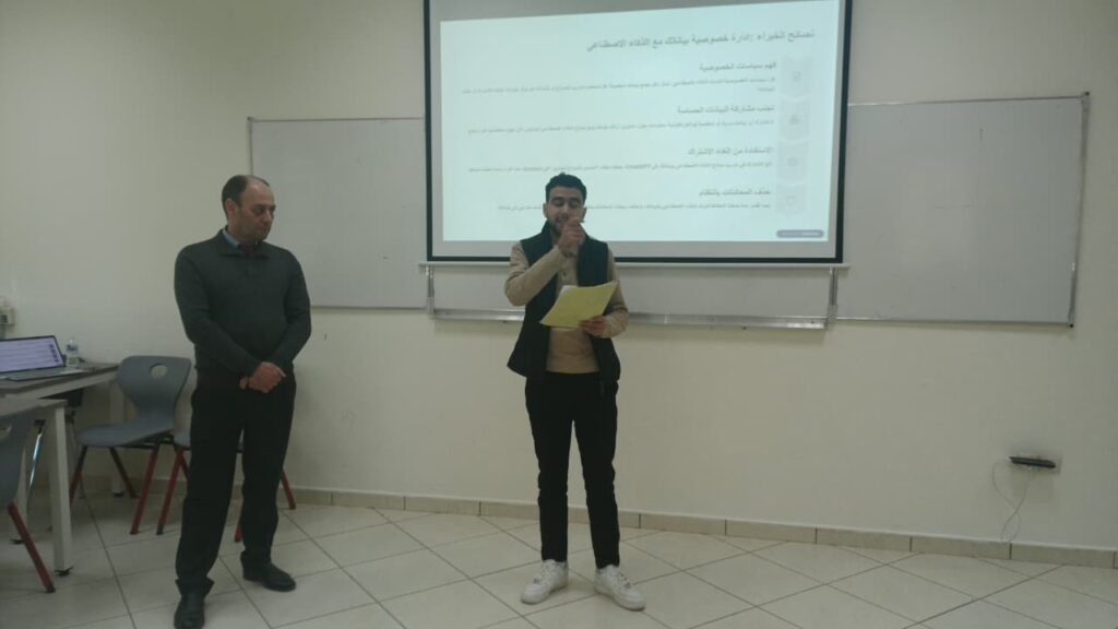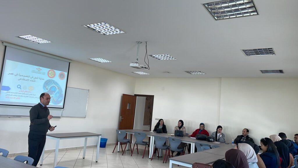 انتقلت الدورة إلى الجانب التطبيقي من خلال ورشات تفاعلية شارك فيها الطلبة بفعالية، حيث تمت محاكاة حالات واقعية تتعلق بانتهاك الخصوصية عبر وسائل التواصل الاجتماعي وكاميرات المراقبة، ثم صياغة مقترح قانوني لحماية الخصوصية من تحديات الذكاء الاصطناعي.