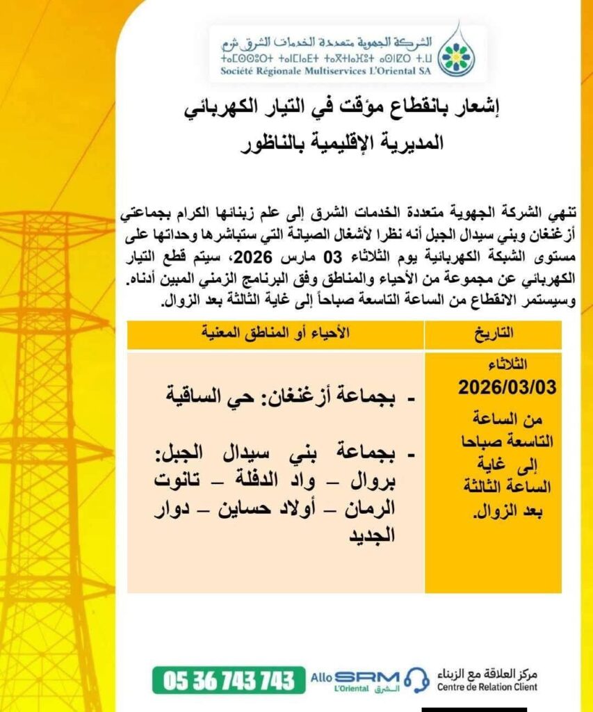 أعلنت المديرية الإقليمية بالناظور التابعة لـ الشركة الجهوية متعددة الخدمات الشرق عن إشعار يهم زبنائها بجماعتي أزغنغان وبني سيدال الجبل، بخصوص انقطاع مؤقت في التيار الكهربائي، وذلك بسبب أشغال صيانة مبرمجة على مستوى الشبكة الكهربائية يوم الثلاثاء 03 مارس 2026، من الساعة التاسعة صباحاً إلى غاية الثالثة بعد الزوال.