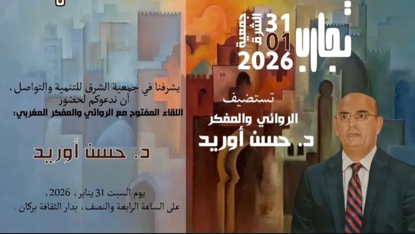 تستضيف جمعية الشرق للتنمية والتواصل المفكر والروائي المغربي البارز الدكتور حسن أوريد، في لقاء فكري وثقافي مفتوح يجمع نخبة من المثقفين والمهتمين، وذلك يوم السبت 31 يناير 2026، في تمام الساعة الرابعة والنصف مساءً برحاب دار الثقافة بمدينة بركان.