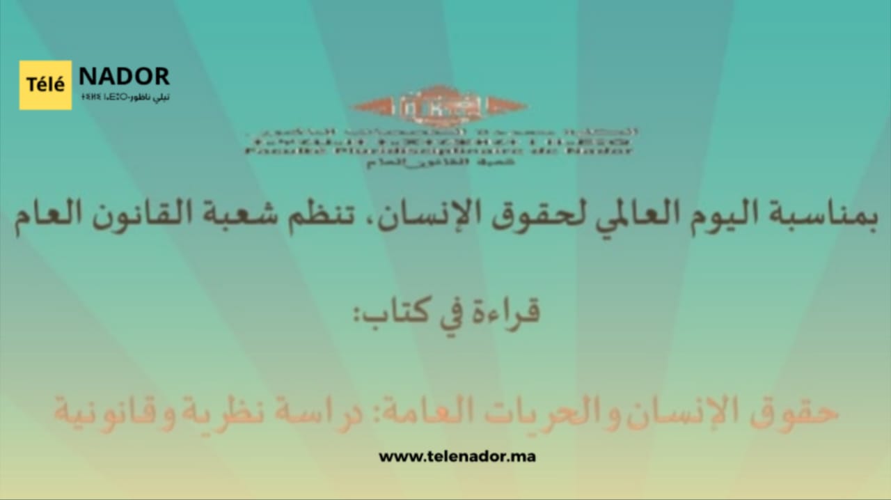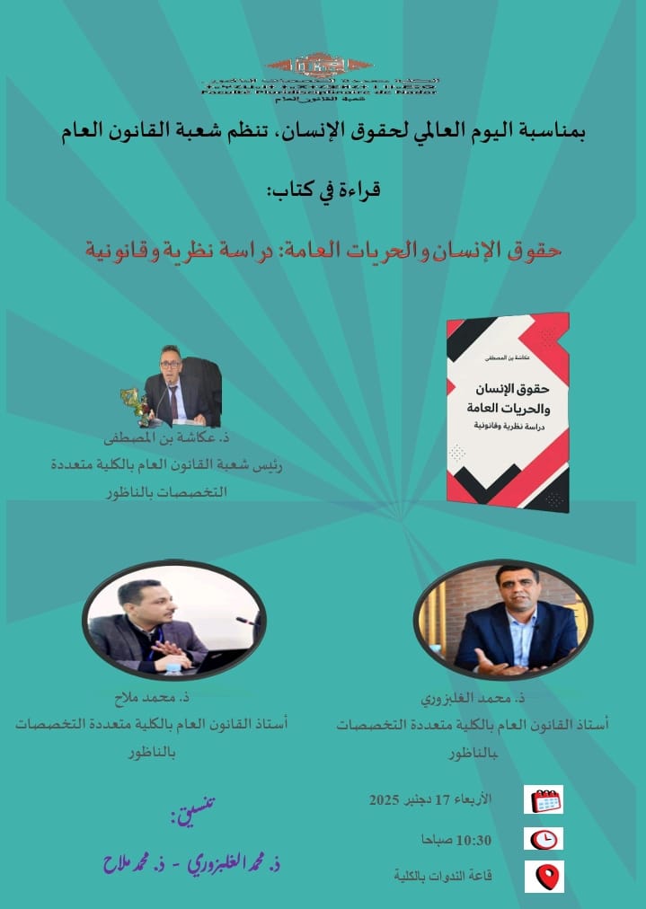 بمناسبة اليوم العالمي لحقوق الإنسان، تنظم شعبة القانون العام بالكلية متعددة التخصصات بالناظور لقاءً علميًا يتمثل في قراءة في كتاب “حقوق الإنسان والحريات العامة: دراسة نظرية وقانونية”، وذلك في إطار ترسيخ الثقافة الحقوقية وتعزيز النقاش الأكاديمي حول قضايا الحقوق والحريات.