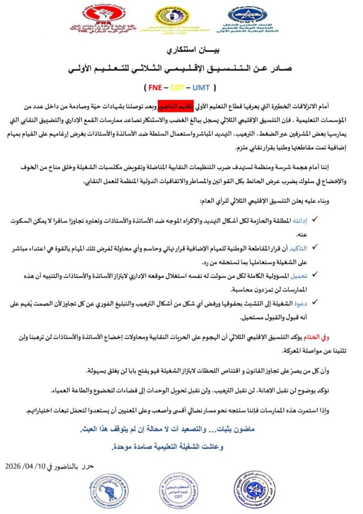 أصدر التنسيق النقابي الثلاثي للتعليم الأولي بإقليم الناظور (FNE – CDT – UMT) بيانًا شديد اللهجة، عبّر فيه عن استنكاره لما وصفه بالتضييق على الحريات النقابية، متهماً بعض المشرفين التابعين للجهة المشغلة بممارسة ضغوطات على الأطر التربوية بسبب مقاطعتهم للمهام الإضافية.