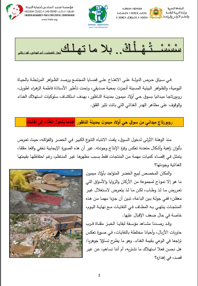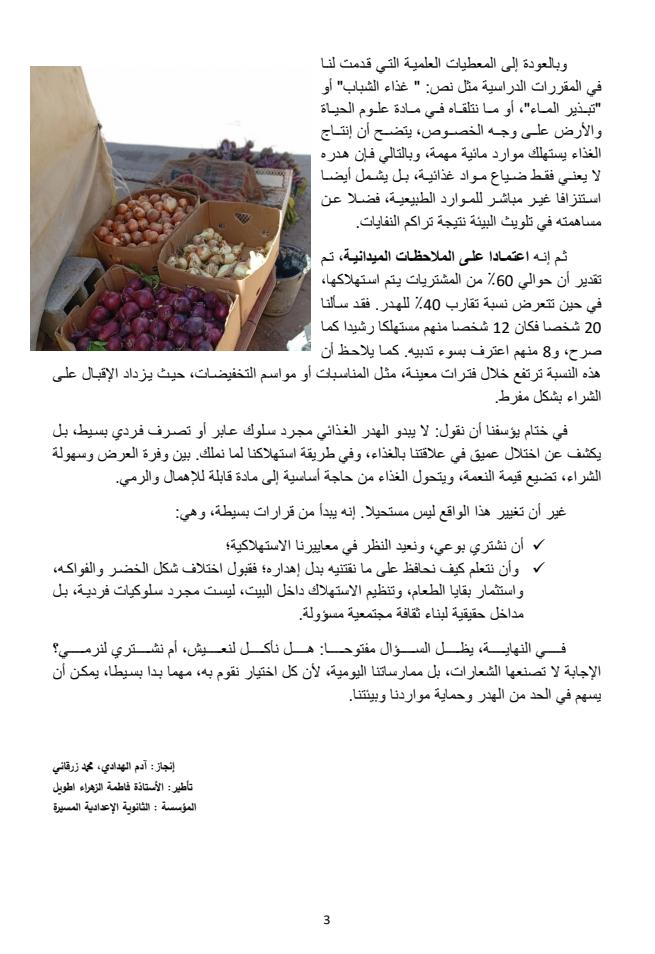 و يؤكد هذا العمل التربوي الذي أنجزه التلميذان آدم الهدادي ومحمد زرقاني، من إعدادية المسيرة ، أن الهدر الغذائي ليس سلوكًا بسيطًا، بل ظاهرة تتطلب وعيًا جماعيًا، يبدأ من قرارات فردية بسيطة كشراء الضروري واحترام قيمة النعمة، من أجل حماية الموارد والبيئة.
