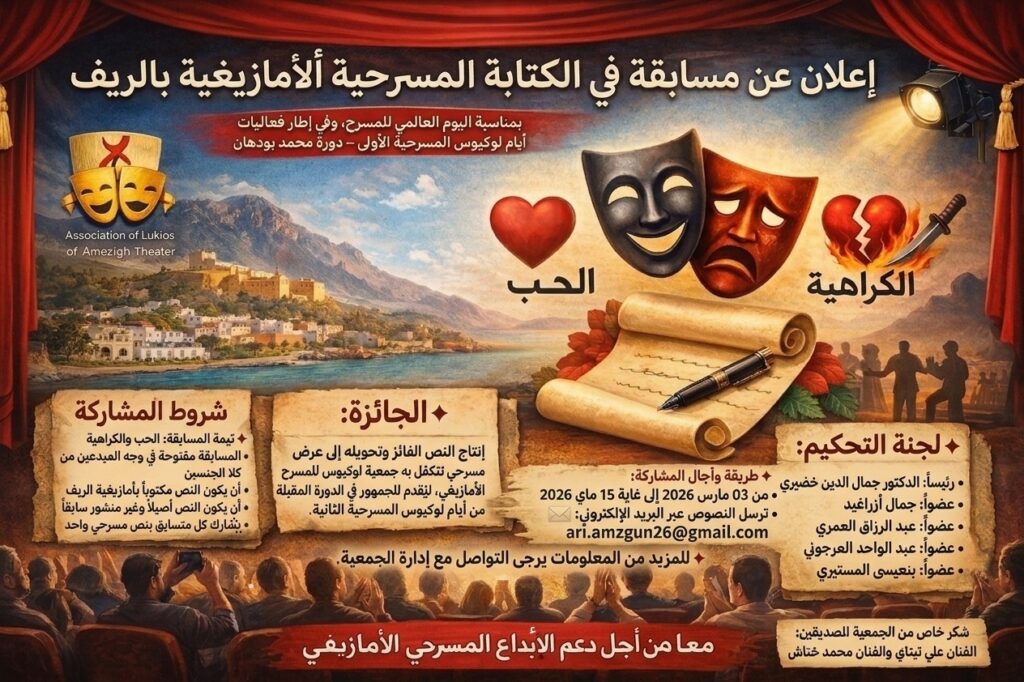 بمناسبة اليوم العالمي للمسرح، وفي إطار فعاليات أيام لوكيوس المسرحية الأولى دورة محمد بودهان، تنظم جمعية لوكيوس للمسرح الأمازيغي مسابقة في الكتابة المسرحية بالأمازيغية الريفية.