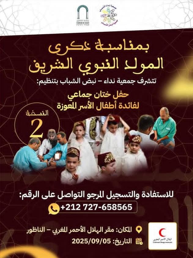 في إطار الاحتفال بذكرى المولد النبوي الشريف، تتشرف جمعية “نبض الشباب” بتنظيم النسخة الثانية من الحفل الجماعي للختان لفائدة الأسر المعوزة، وذلك يوم 5 شتنبر 2025 بمقر الهلال الأحمر المغربي – الناظور.