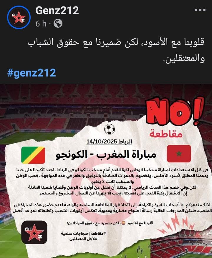 لذلك، دعت حركة GenZ212 الجماهير المغربية إلى اتخاذ موقف رمزي يتمثل في ترك المدرجات خالية خلال المباراة، حتى تكون تلك الصورة رسالة احتجاج حضارية ومدوية تعبّر عن وعي الشعب وتطلعاته نحو مستقبل أفضل.