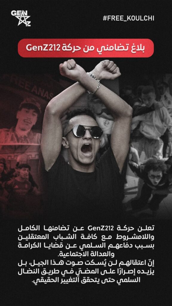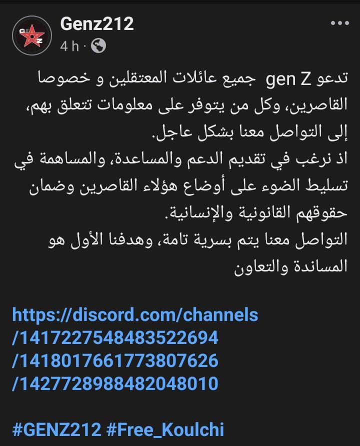 نشرت حركة GenZ212 دعوة عاجلة لكافة عائلات المعتقلين، وخصوصا القاصرين، وكل من يمتلك معلومات تتعلق بهم، للتواصل مع الحركة فورا. وتهدف المبادرة إلى تقديم الدعم والمساعدة لهؤلاء القاصرين وضمان حقوقهم القانونية والإنسانية.
