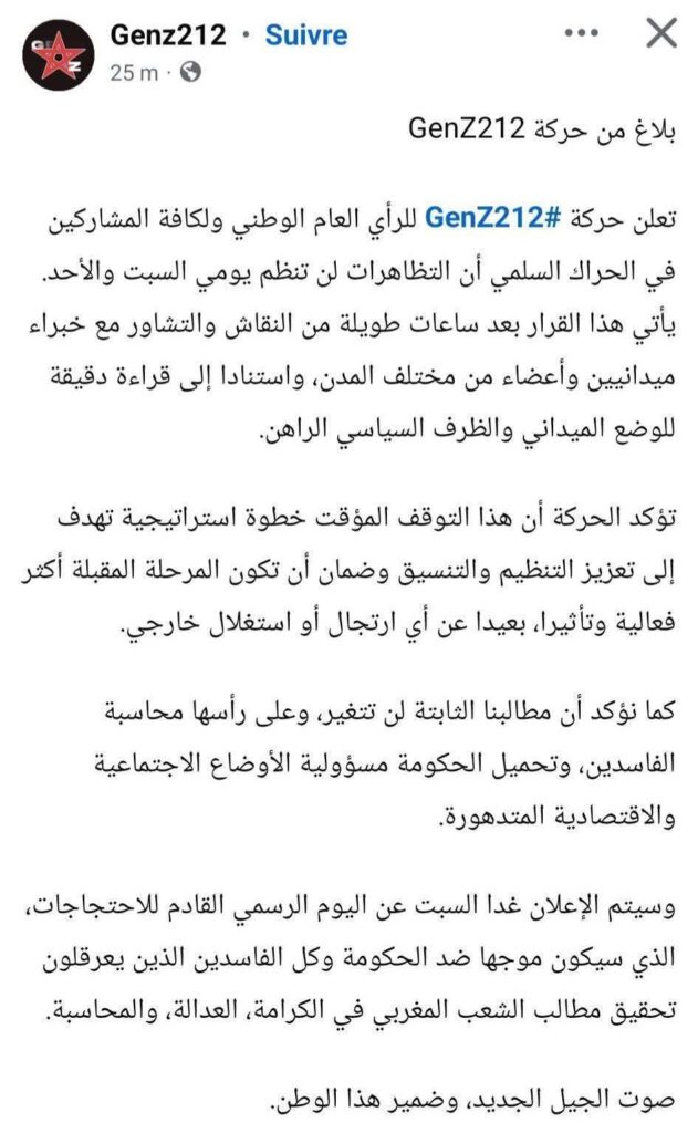 أعلنت حركة GenZ212 في بلاغ رسمي للرأي العام الوطني عن قرارها بعدم تنظيم التظاهرات يومي السبت والأحد، مؤكدة أن هذا القرار جاء بعد نقاشات مطولة مع خبراء وأعضاء من مختلف المدن، وارتكز على قراءة دقيقة للوضع الميداني والسياسي الراهن.