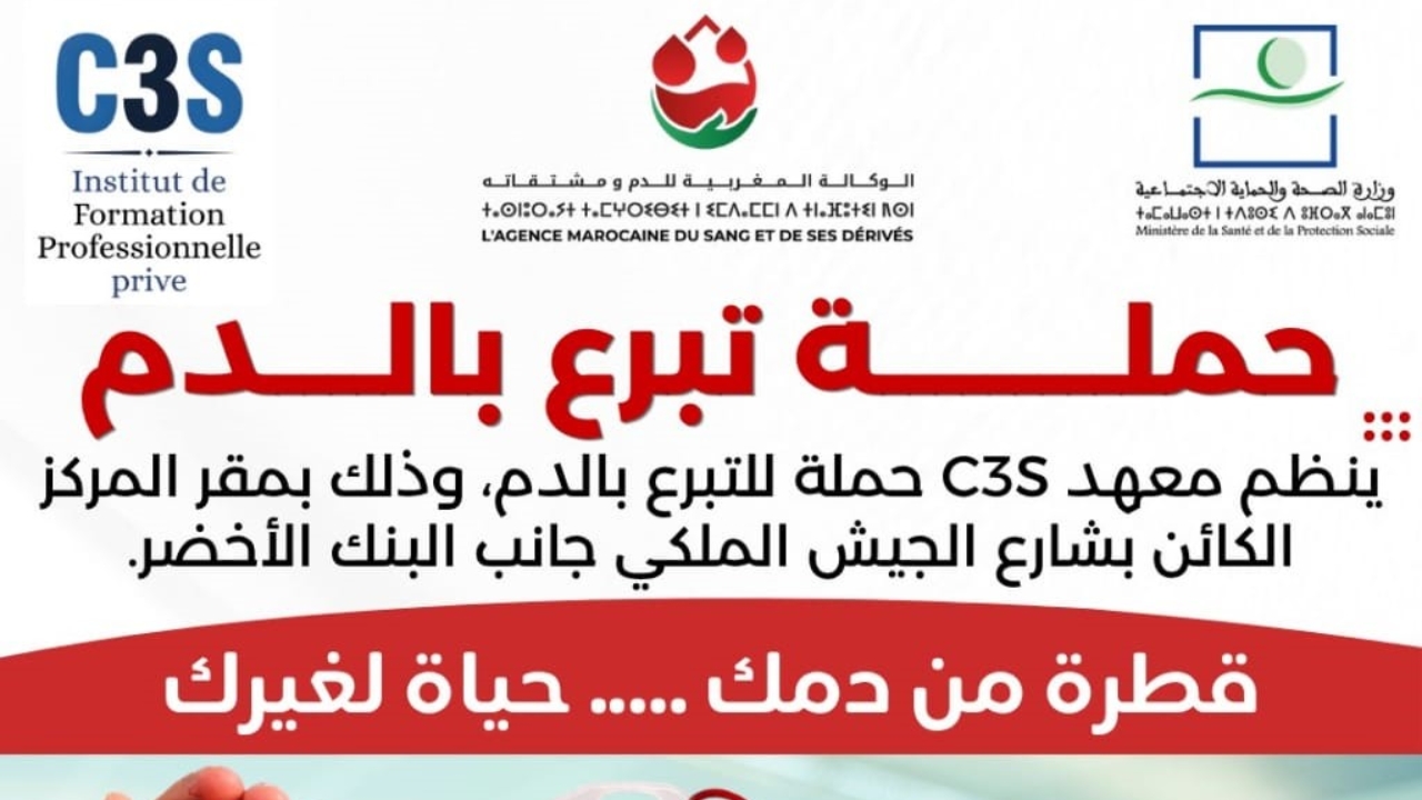ينظم معهد التكوين المهني الخاص C3S حملة تبرع بالدم بشراكة مع الوكالة المغربية للدم ومشتقاته ووزارة الصحة والحماية الاجتماعية، بهدف دعم المخزون الوطني من المادة الحيوية وتلبية احتياجات المستشفيات.