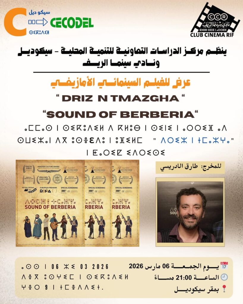 ينظم مركز الدراسات التعاونية للتنمية المحلية – سيكوديل بشراكة مع نادي سينما الريف عرضا سينمائيا مميزا للفيلم الأمازيغي “DRIZ N TMAZGHA” (SOUND OF BERBERIA)، من إخراج طارق الإدريسي، وذلك يوم الجمعة 06 مارس 2026 على الساعة التاسعة مساء بمقر سيكوديل.