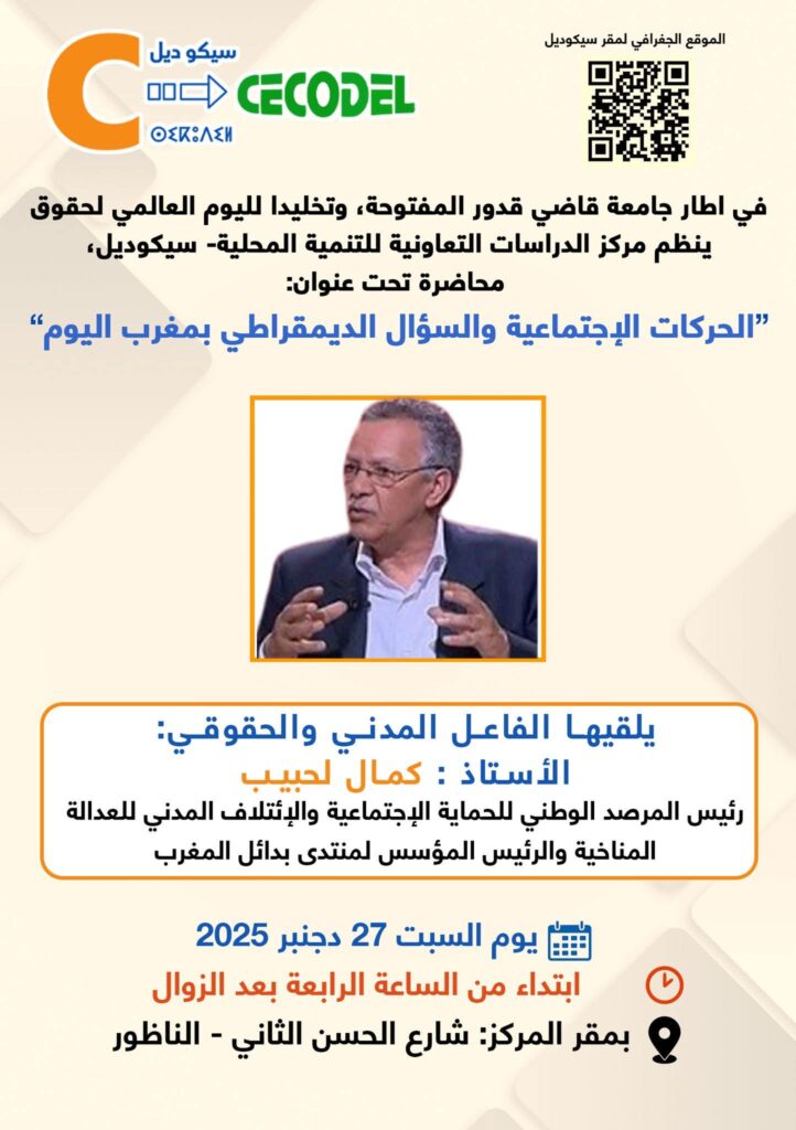 في إطار أنشطتها الأكاديمية والفكرية، وتخليدًا لليوم العالمي لحقوق الإنسان، ينظم مركز الدراسات التعاونية للتنمية المحلية “سيكوديل” محاضرة فكرية تسلط الضوء على راهن الحركات الاجتماعية وعلاقتها بالسؤال الديمقراطي بالمغرب، وذلك ضمن برنامج جامعة قاضي قدور المفتوحة.