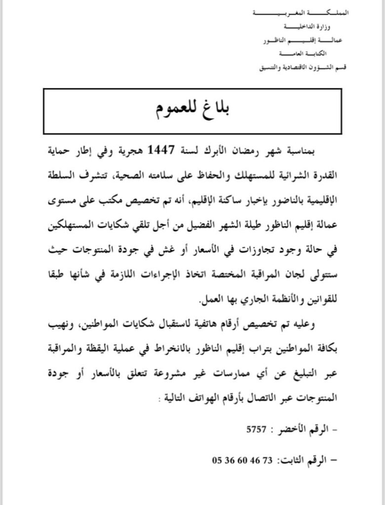 وشدد عامل الإقليم، في إطار تطوير قنوات التواصل، على ضرورة تلقي ومعالجة التبليغات والشكايات الصادرة عن المستهلكين والتجار وفعاليات المجتمع المدني عبر الرقم الأخضر 5757، المتعلق بقضايا التموين والجودة والأسعار، مع التأكيد على التدخل الفوري والفعال لمعالجة كافة الشكايات المتوصل بها، والسهر على مراقبة الأثمان وضمان شفافية المعاملات التجارية طبقاً للقوانين الجاري بها العمل.