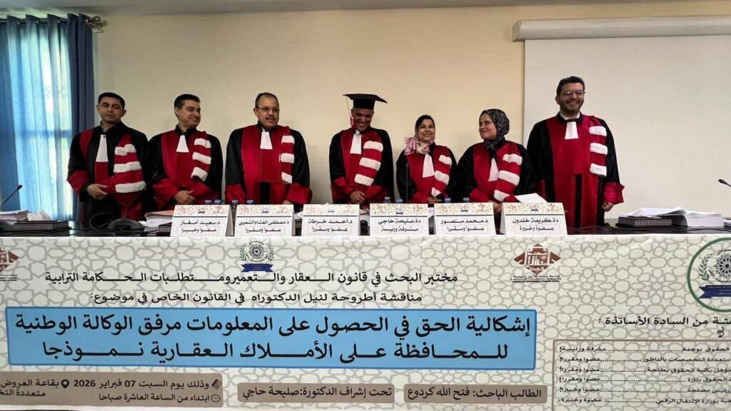 الأطروحة، التي أشرفت عليها الدكتورة صليحة حاجي، أستاذة التعليم العالي بكلية الحقوق بوجدة، ركزت على دراسة أهمية الحق في الحصول على المعلومات داخل الإدارة العمومية، باعتباره أحد الركائز الأساسية للشفافية والحكامة الجيدة، وخاصة في المرافق الحساسة مثل الوكالة الوطنية للمحافظة على الأملاك العقارية.