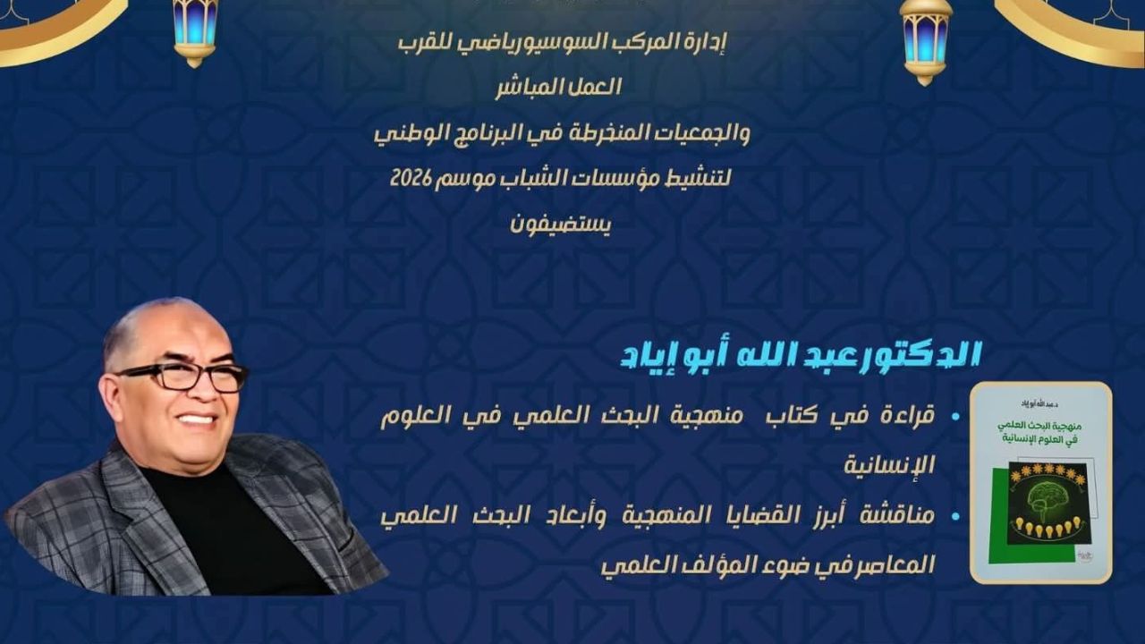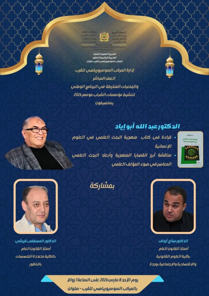 تحتضن مدينة سلوان يوم الأحد 8 مارس 2026 لقاءً علمياً ضمن البرنامج الوطني لتنشيط مؤسسات الشباب، حيث تنظم إدارة المركب السوسيو-رياضي للقرب بسلوان هذا الموعد الأكاديمي ابتداءً من الساعة الواحدة زوالاً، مستضيفة الدكتور عبد الله أبو إياد لقراءة علمية في كتابه «منهجية البحث العلمي في العلوم الإنسانية»، في مبادرة تروم فتح نقاش معرفي حول قضايا البحث العلمي وتطوير أدواته في مجالات العلوم الإنسانية.