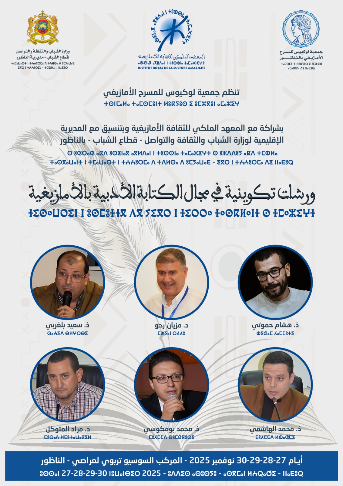 تنظم جمعية لوكيوس للمسرح الأمازيغي ورشات تكوينية في مجال الكتابة الأدبية بالأمازيغية وبحرفها تيفيناغ في إطار مشروع تعلم كتابة الرواية والقصة بالأمازيغية، مجال التعابير الأدبية والفنية بشراكة مع المعهد الملكي للثقافة الأمازيغية برسم سنة 2025، والخاص بالجمعيات الوطنية العاملة في مجال النهوض بالثقافة الأمازيغية، وبتنسيق مع المديرية الإقليمية لوزارة الشباب والثقافة والتواصل – قطاع الشباب بالناظور، وذلك أيام 27/28/29/30 نوفمبر 2025 بالمركب السوسيو تربوي لعراصي بالناظور.