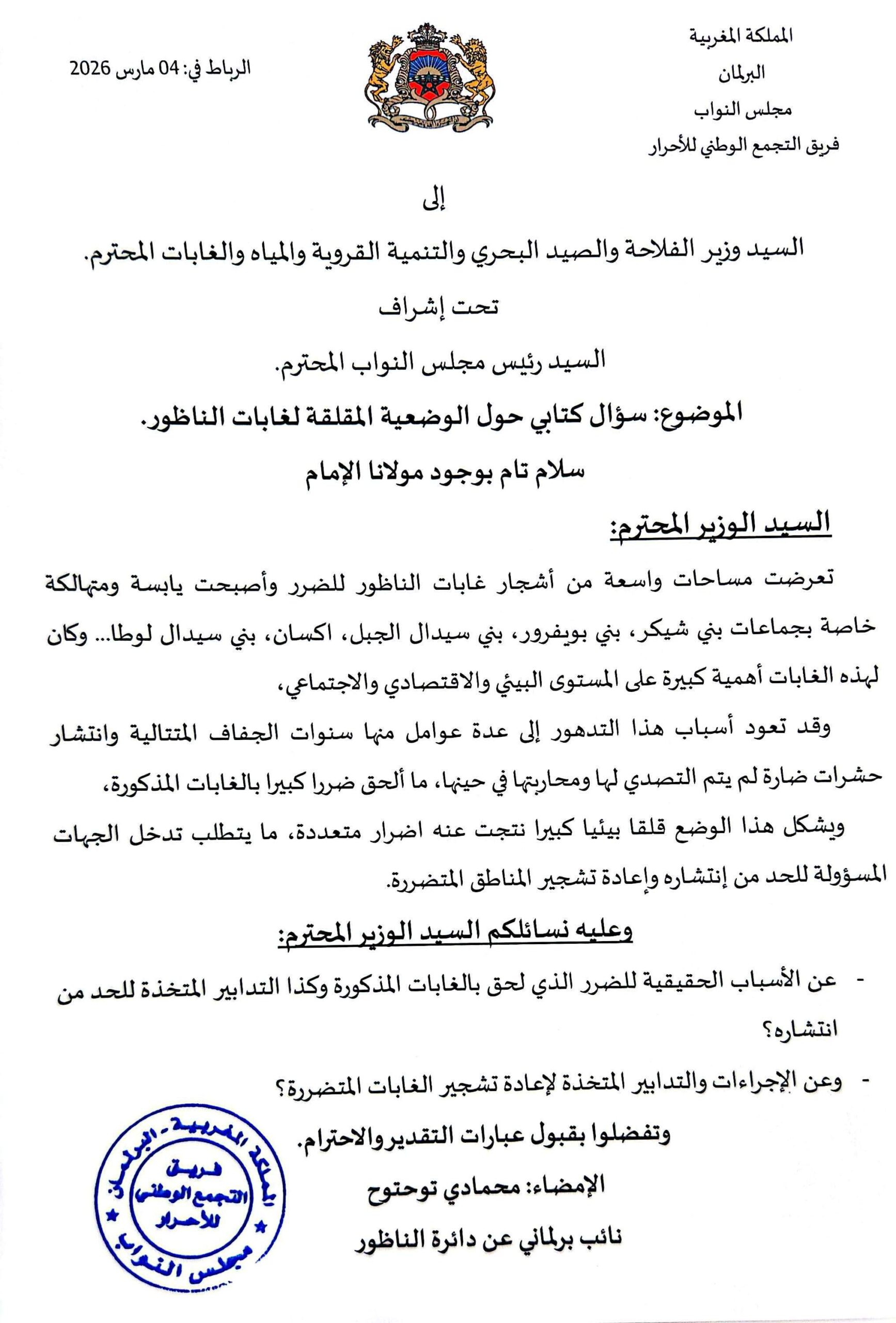 وسط تدهور ملحوظ يغطي مساحات واسعة من غابات الناظور، وجه النائب البرلماني عن دائرة الناظور، محمادي توحتوح، سؤالًا كتابيًا إلى وزير الفلاحة والصيد البحري والتنمية القروية والمياه والغابات، طالب فيه بالكشف عن الأسباب الحقيقية وراء هذا الضرر والإجراءات المتخذة لإعادة تأهيل الغابات المتضررة.
