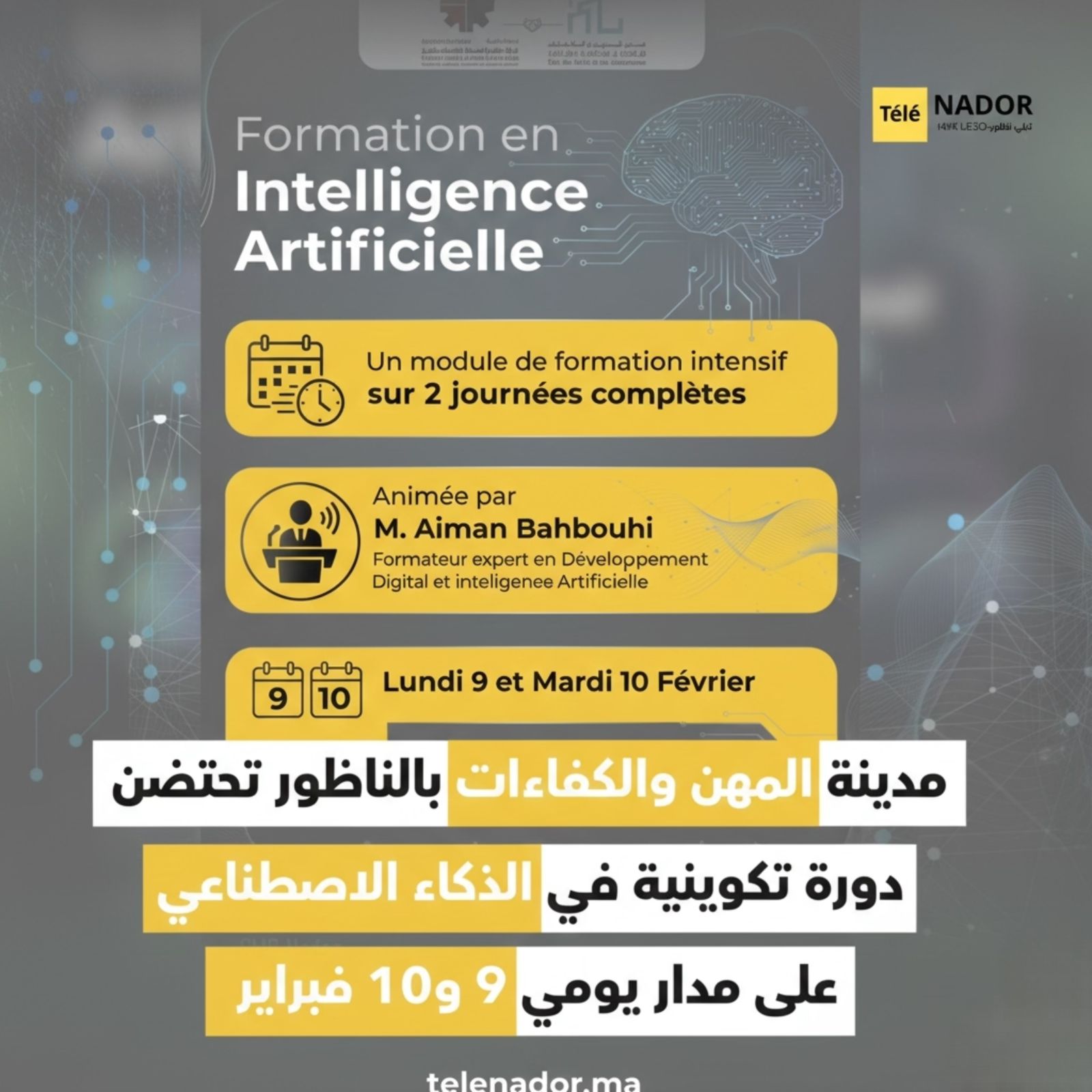 تحتضن مدينة المهن والكفاءات بالناظور، على مدار يومي 9 و10 فبراير، دورة تكوينية متخصصة في مجال الذكاء الاصطناعي، وذلك في إطار تنزيل التوصيات الواردة في تقرير البنك الأوروبي لإعادة الإعمار والتنمية، الرامية إلى تعزيز الكفاءات الرقمية ومواكبة التحولات التكنولوجية المتسارعة.