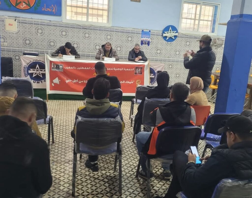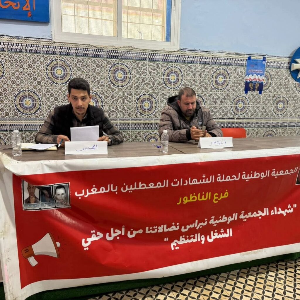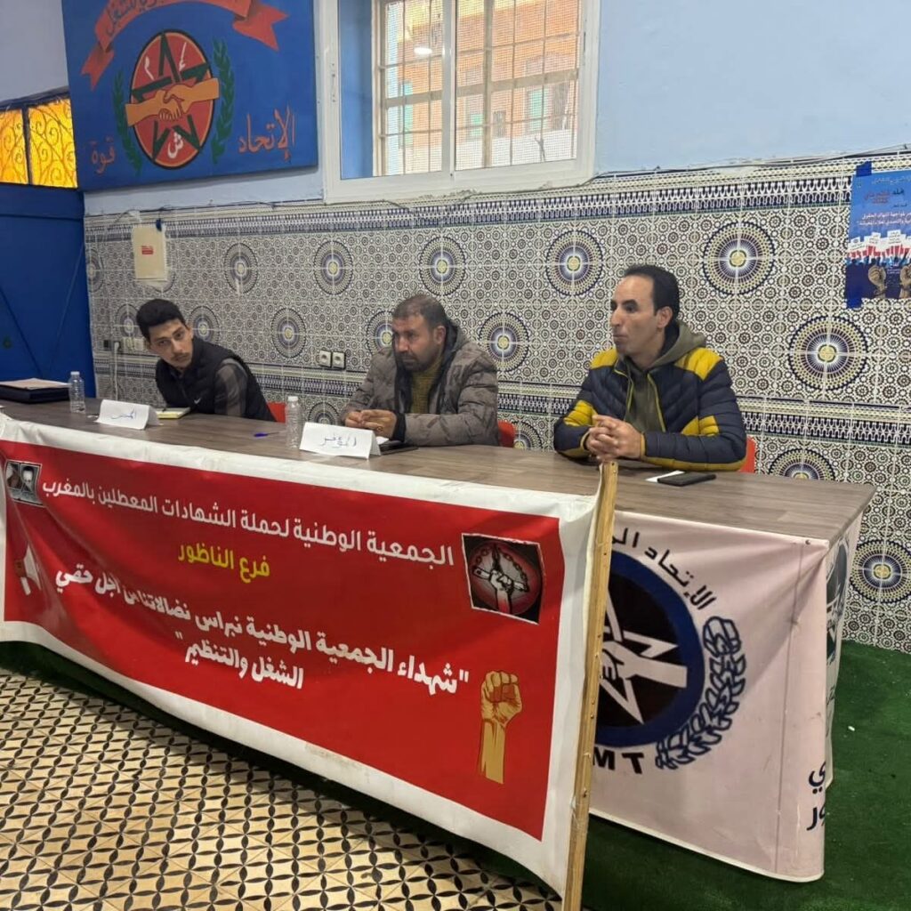 نظم فرع الناظور للجمعية الوطنية لحملة الشهادات المعطلين بالمغرب، يوم الأحد 15 فبراير 2026، ندوة إشعاعية بعنوان “البطالة وبرامج التشغيل، أية علاقة؟”، بمقر الاتحاد المغربي للشغل، من تأطير مكتب الفرع.
