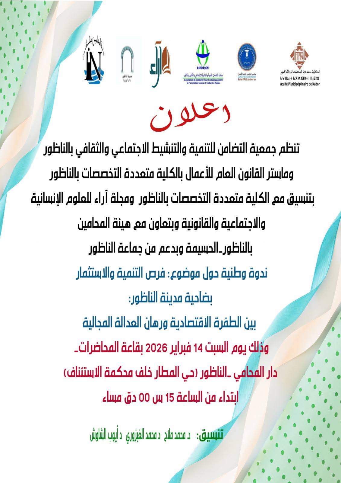 تنظم جمعية التضامن للتنمية والتنشيط الاجتماعي والثقافي بالناظور، بشراكة مع ماستر القانون العام للأعمال بالكلية متعددة التخصصات بالناظور، وبتنسيق مع الكلية نفسها ومجلة آراء للعلوم الإنسانية والاجتماعية والقانونية، وبتعاون مع هيئة المحامين بالناظور الحسيمة، وبدعم من جماعة الناظور، ندوة وطنية حول موضوع: “فرص التنمية والاستثمار بضاحية مدينة الناظور: بين الطفرة الاقتصادية ورهان العدالة المجالية”، وذلك يوم السبت 14 فبراير 2026، ابتداءً من الساعة الثالثة بعد الزوال، بقاعة المحاضرات بدار المحامي بحي المطار، خلف محكمة الاستئناف بالناظور.