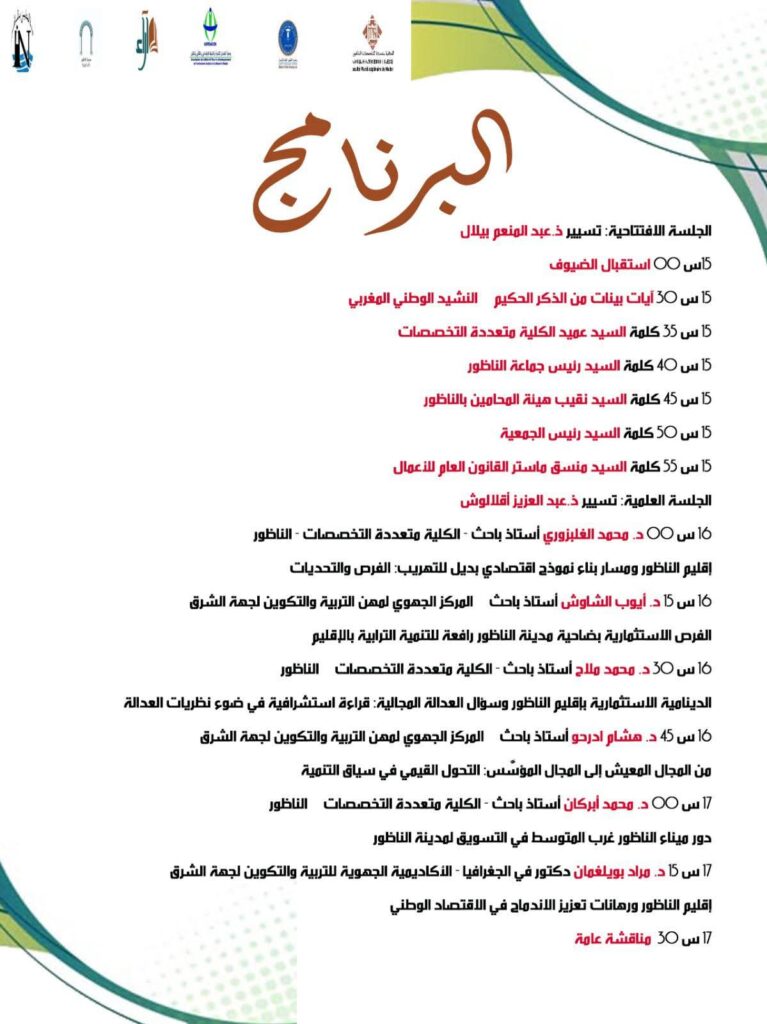 ومن جهته، سيسلط الدكتور هشام ادرحو الضوء على التحول القيمي في سياق التنمية، من خلال الانتقال من المجال المعيش إلى المجال المؤسس، فيما سيتناول الدكتور محمد أبركان دور ميناء الناظور غرب المتوسط في التسويق الترابي للمدينة وتعزيز جاذبيتها الاقتصادية.
