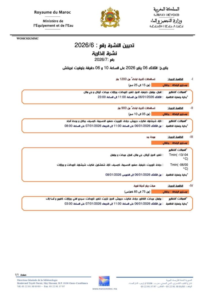 أصدرت وزارة التجهيز والماء، اليوم الثلاثاء 6 يناير، نشرة إنذارية تحذر من تقلبات جوية قوية ستهم عدداً من مناطق المملكة، تشمل تساقطات ثلجية مهمة، وموجة برد قاسية، إضافة إلى هبات رياح قوية، وذلك ابتداءً من اليوم وإلى غاية الأيام القليلة المقبلة.