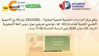 تيلي ناظور : نوال أموسى ينظم مركز الدراسات التعاونية للتنمية المحلية (CECODEL)، بشراكة مع أكاديمية الأطلسي الكندية للغات (ACLA)، لقاءً…